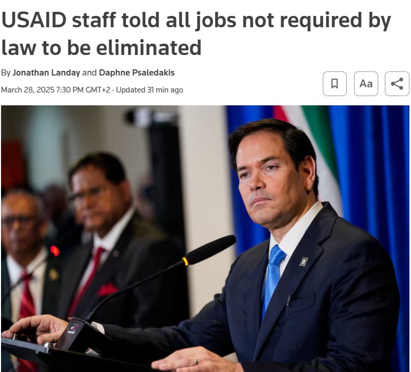 Згідно з меморандумом, яким володіє Reuters, усі посади USAID, не встановлені законом, «будуть ліквідовані», і весь персонал агентства по всьому світу незабаром отримає електронні повідомлення з повідомленням про рішення.