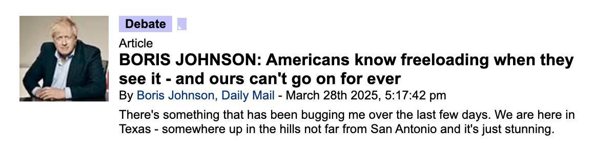 На його думку, американці «не мають таких соціальних гарантій, як у Європі», і їхні податкові відрахування йдуть в першу чергу на захист, тоді як європейці отримують набагато більше соціальних благ, включаючи відпустки, лікарняні та декретні допомоги. Джонсон наголосив, що США значно більше витрачають на оборону, ніж Велика Британія та інші європейські країни, і закликав Європу до більшої участі в забезпеченні своєї безпеки.