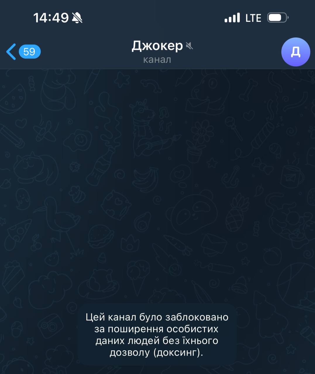 Сьогодні в акаунті Telegram-каналу «Джокер» з’явилося повідомлення, що його заблоковано за поширення особистих даних людей без їхнього дозволу.
