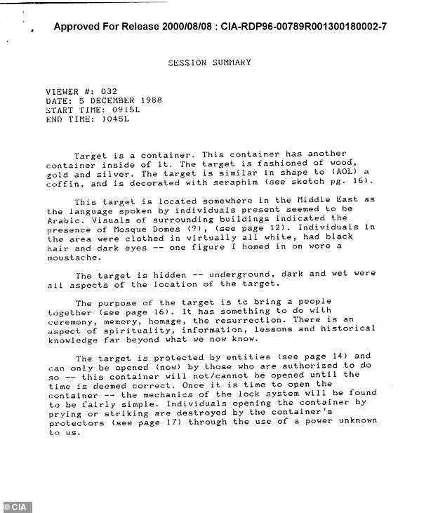 Під час одного з таких тестів спостерігачеві дали опис Ковчега (не сказавши, що це) і він заявив, що цей об’єкт зберігається "десь на Близькому Сході", а поруч знаходяться люди, які розмовляють арабською. Проте сама скриня знайдена не була.