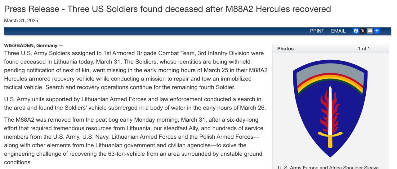 У Литві під час військових навчань знайшли мертвими трьох американських військових, які раніше зникли безвісти. Пошуки четвертого військовослужбовця тривають.