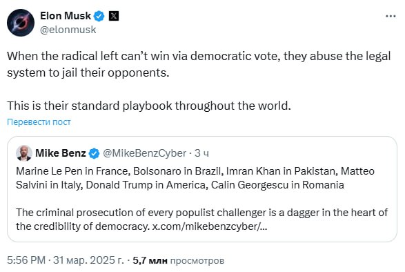 "Коли радикальні ліві не можуть перемогти на демократичних виборах, вони зловживають системою правосуддя, щоб посадити своїх опонентів у в’язницю. Це їхня стандартна тактика по всьому світу", – написав Маск у соцмережі X.