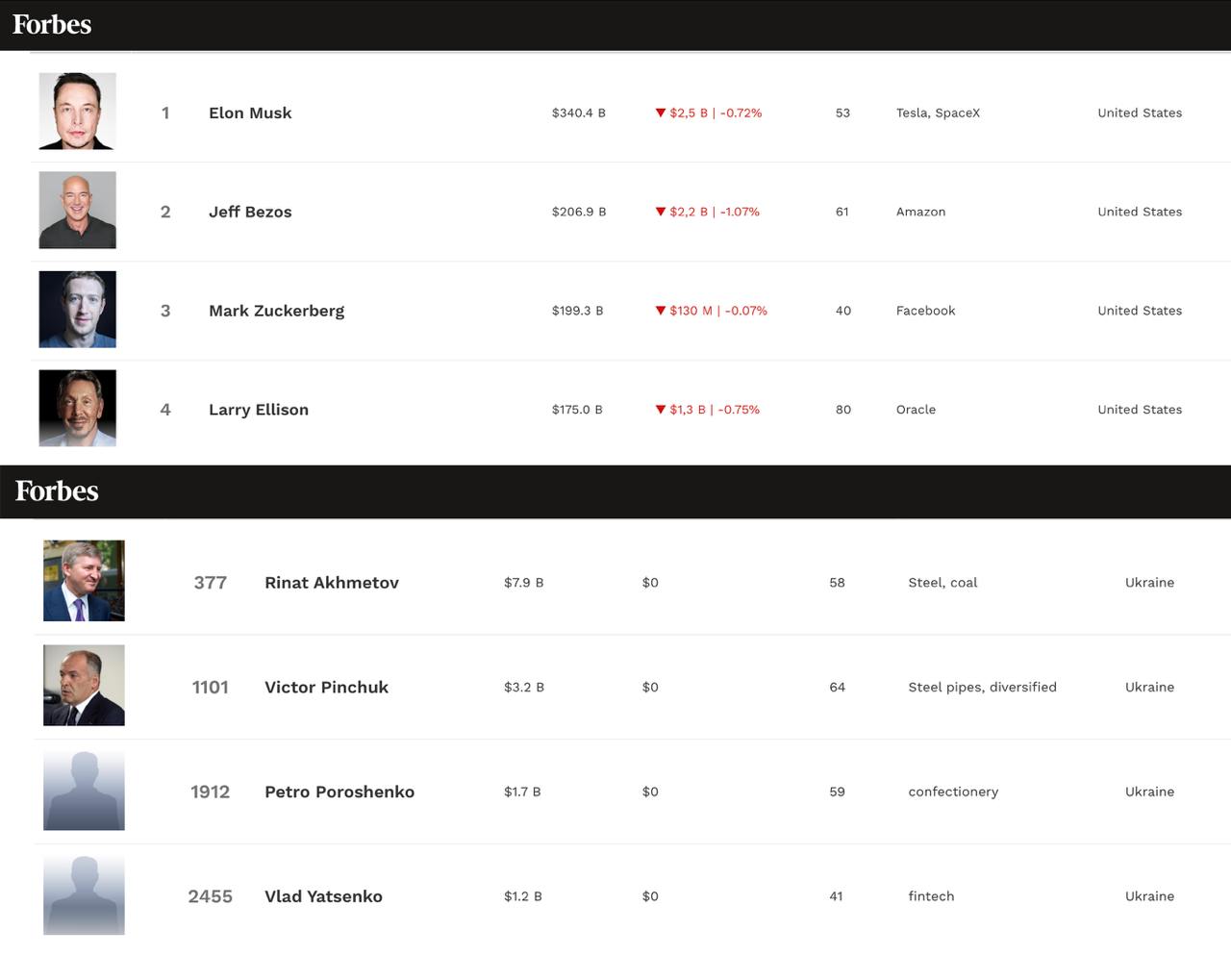 Згідно з рейтингом Forbes, жоден з українських мільярдерів не збільшив своє багатство за минулий рік.