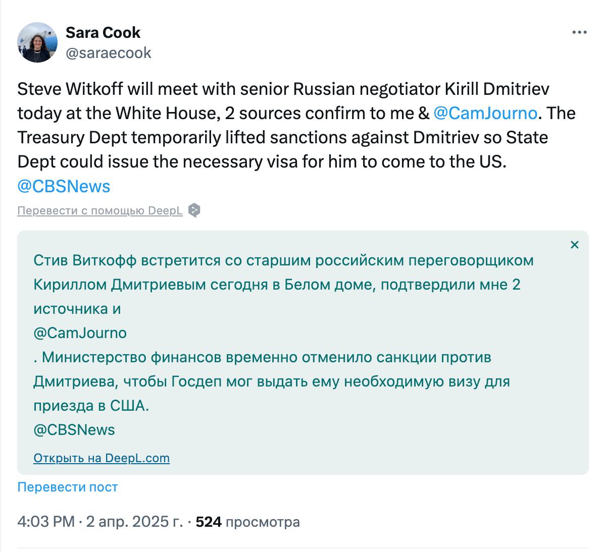 Про можливу зустріч раніше повідомляв також телеканал CBS, посилаючись на свої джерела. Дмитрієв підтвердив інформацію про переговори, зазначивши, що для їх проведення з нього тимчасово знімуть санкції.