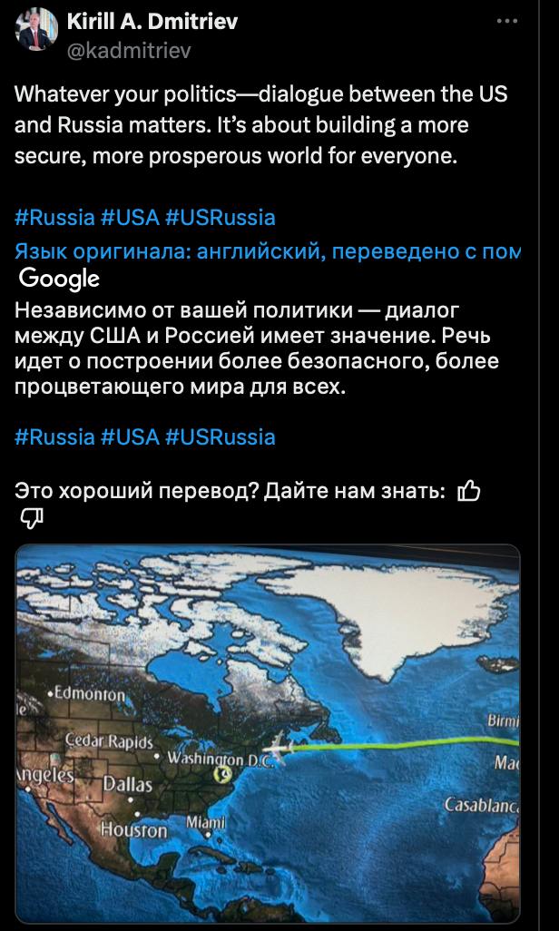 Дмитрієв натякнув, що вже прибув до Вашингтона