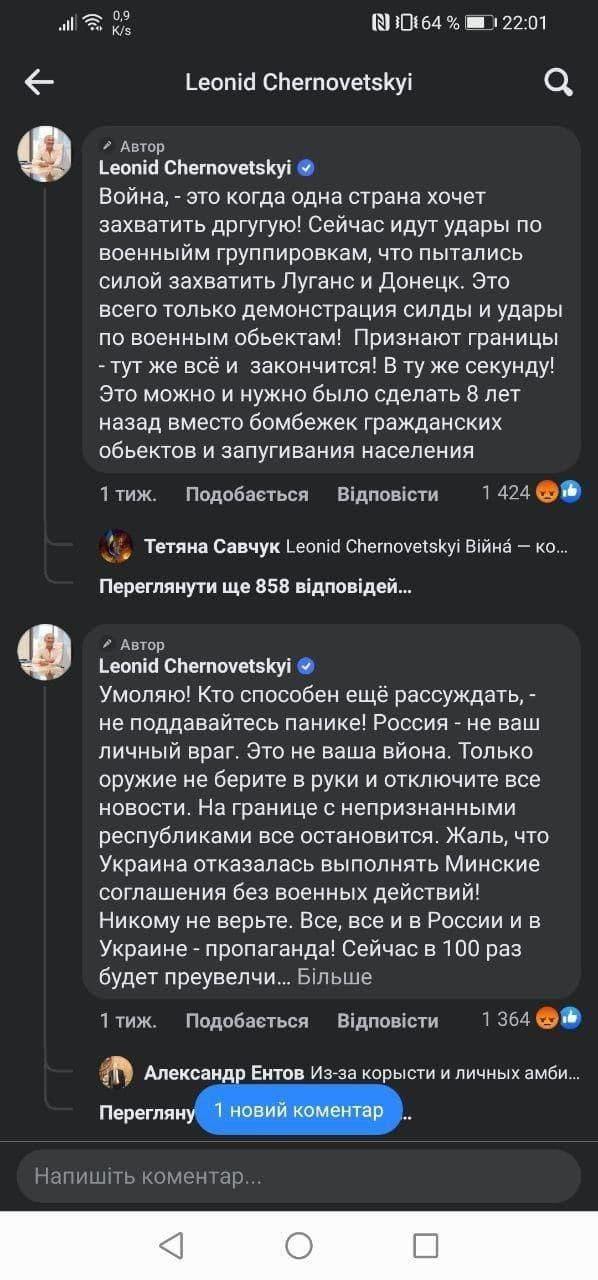 Черновецькому було оголошено підозру за статтею 110 Кримінального кодексу України (посягання на територіальну цілісність і недоторканність України) через його публікації в соцмережах, що фактично виправдовували російську агресію. Офіс Генпрокурора оприлюднив заяву про підозру ще в червні 2022 року, але з того часу не відбулося жодних значних змін у справі.