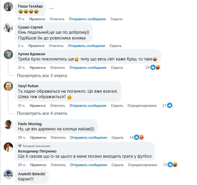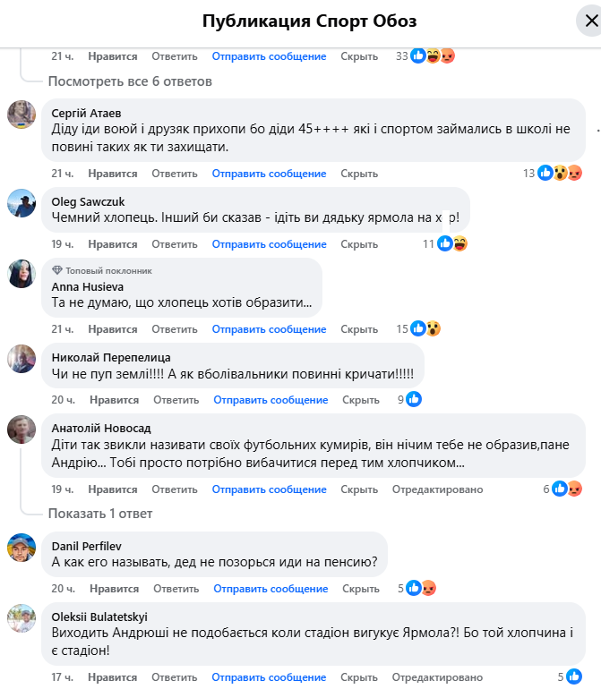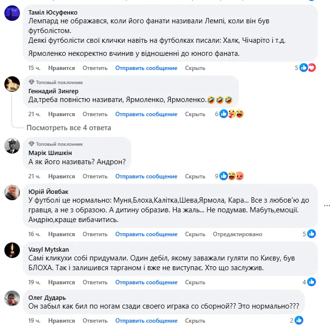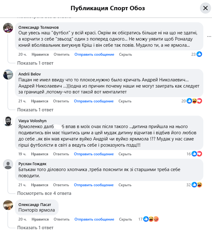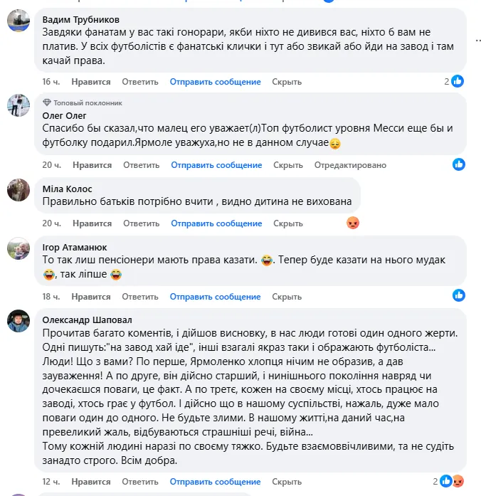 "Андрюха вражає без баяна. Для хлопців ти Ярмола", "Хлопець не мав на увазі нічого поганого", "Понторіз Ярмола", "Не пуп землі!" А як уболівальники повинні кричати?", "Трохи корона мала за розміром", "Перестав поважати через таку тупість", "Ярмола трохи перегнув", "Вимкни зірку!", "Ярмоленко хлопця нічим не образив, а зробив зауваження", "Видно, що дитина невихована", – коментували в мережі.