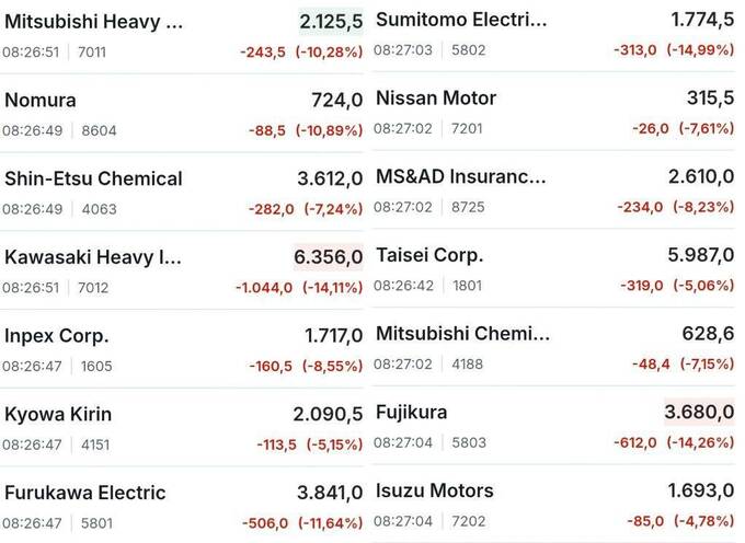 Тайванський високотехнологічний фондовий індекс впав ще сильніше — на 9,8%, що є найзначнішим зниженням за всю його історію. Індекс токійської біржі Nikkei 225 у перші 30 хвилин торгів знизився на 8%. Індекс південнокорейського фондового ринку KOSPI впав більше ніж на 5%.
