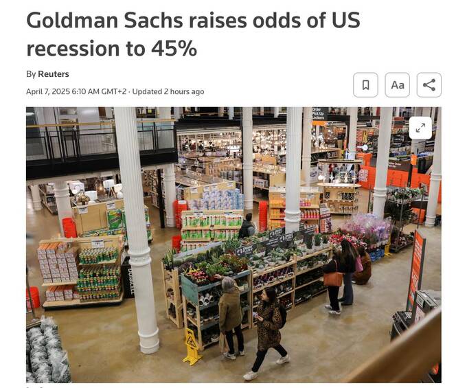 Як повідомляє Reuters, банк Goldman Sachs збільшив ймовірність рецесії в США з 35% до 45%. А біржова платформа прогнозів Polymarket оцінює ймовірність рецесії в США цього року на рівні 63%. Цей показник значно виріс з 3 квітня — після оголошення Трампом про нові тарифи. Нещодавно ризик оцінювався в 40%.
