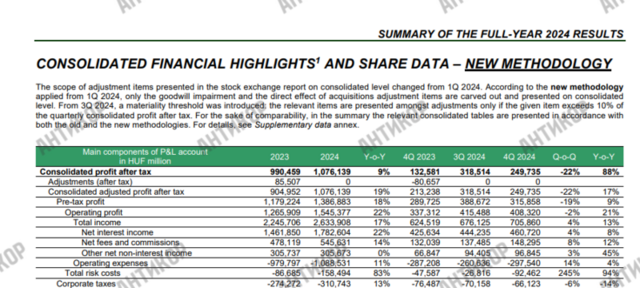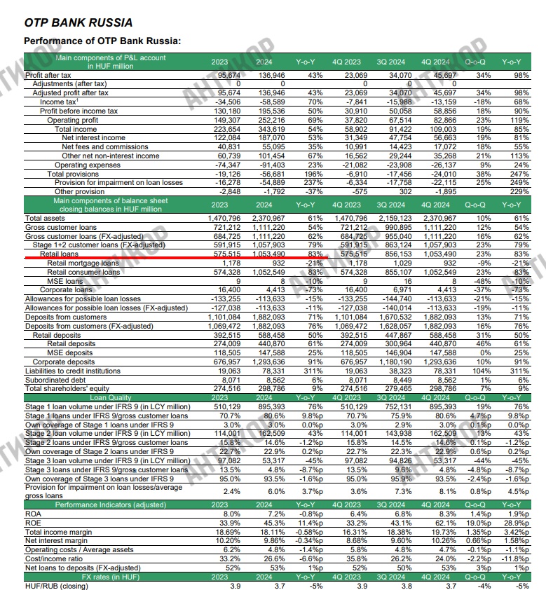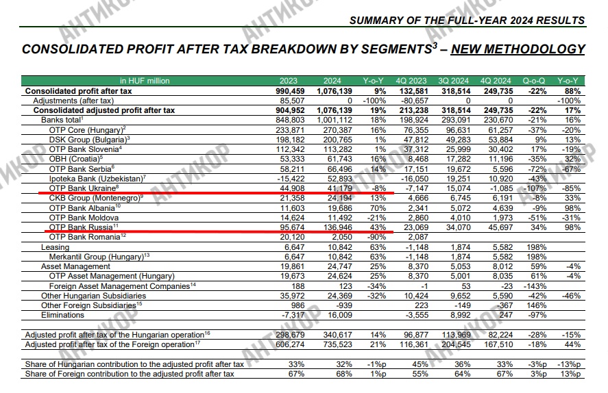 Згідно зі звітом ОТP Group у 2024 році чистий прибуток банку виріс до 1 трильйона угорських форинтів або до 2,9 мільярда доларів. Це на 9% більше ніж за попередній період.
