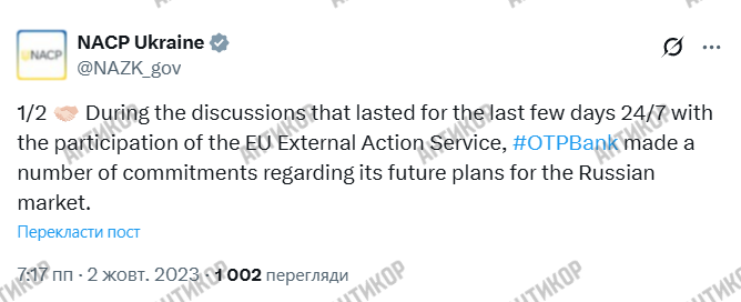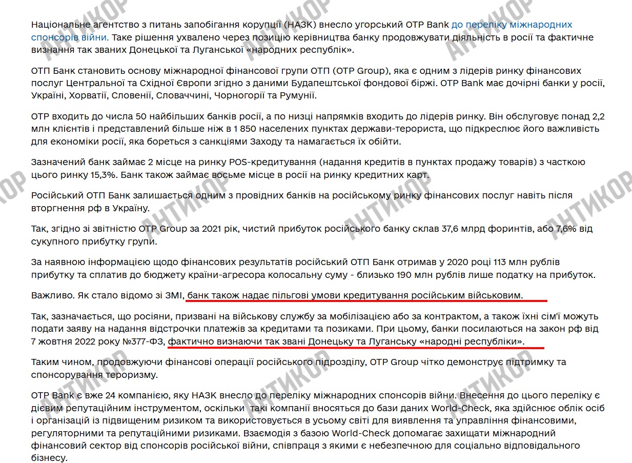«OTP Bank» не просто не скоротив діяльність в Росії з моменту повномасштабного вторгнення російських військ в Україну, він почав нарощувати прибутки та кредитування і перетягувати на себе клієнтів з інших банків. Майже два роки тому Національне агентство із запобігання корупції України внесло «ОТП банк» до списку спонсорів війни, але дуже швидко викреслило. Хоча законодавство та діяльність структури дає всі підстави для обмеження присутності на території України.