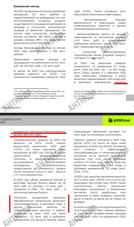 Описуючи розвиток банківського сектору РФ, російське відділення «ОТР Bank» активно користується прокремлівською риторикою. Наприклад у звіті за 2023 рік вживаються такі терміни, як «валюти дружніх країн» чи «єврооблігації у доларах США та інших «токсичних» валютах». Все це вказує на те, що керівництво банку повністю підтримує агресорську політику Кремля.