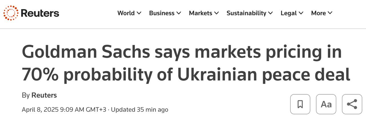 «Наше моделювання показує, що поточна ринкова оцінка мирної угоди зросла з менш ніж 50% до американських виборів до приблизно 70% на цю мить», — йдеться у звіті для клієнтів банку.