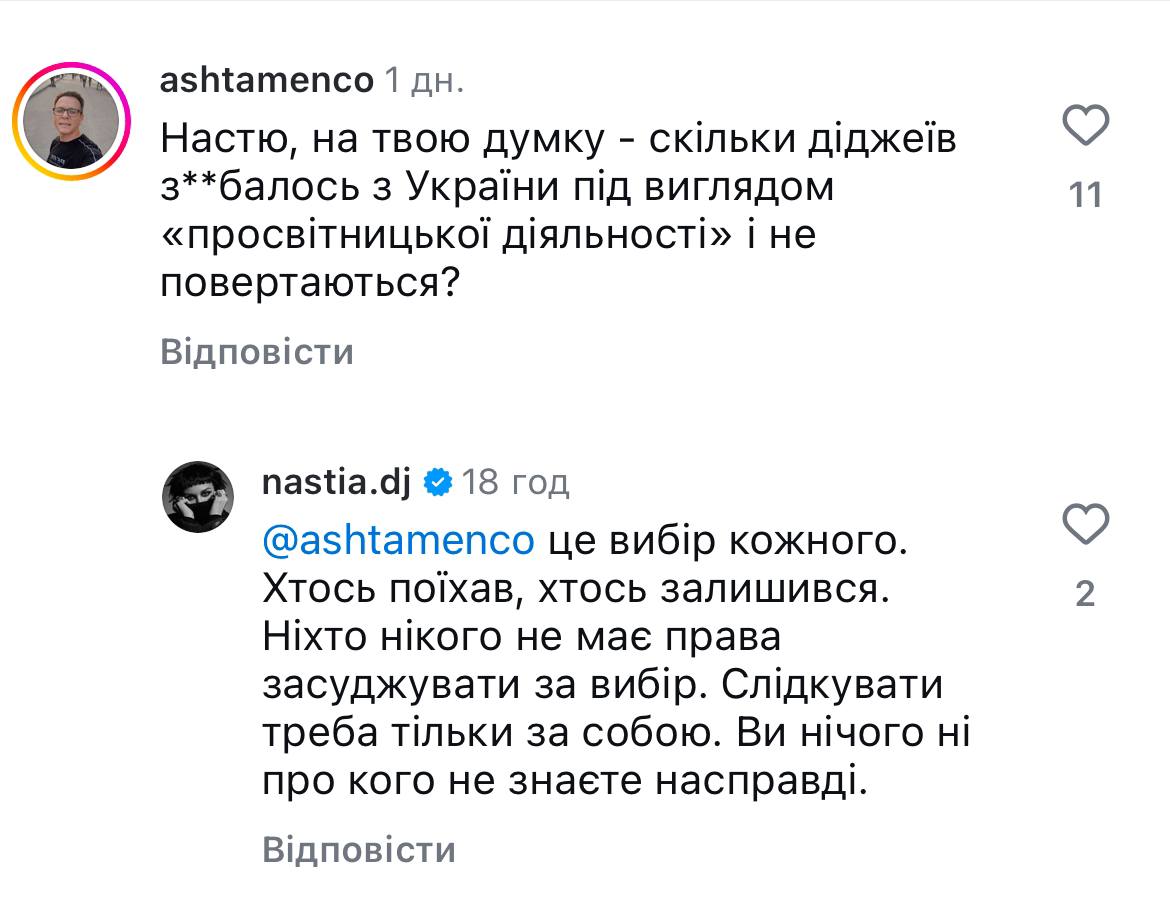 Також один чоловік дорікнув дівчині, що багато діджеїв не повертаються в Україну, виїжджаючи для "просвітницької діяльності". На що вона відповіла, що кожна людина робить свій вибір.