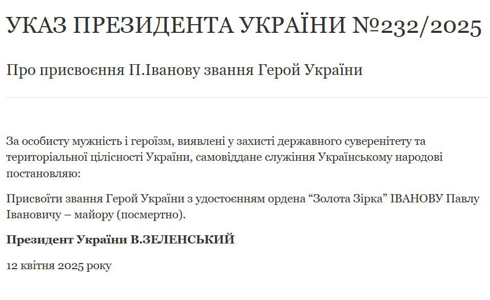Пілот F-16 Павло Іванов 12 квітня віддав своє життя під час виконання бойового завдання. Він захищав Україну у складі Повітряних Сил ЗСУ та загинув як справжній воїн. За заслуги перед країною та видатну службу Павла Іванова відзначено званням Герой України з присвоєнням ордену "Золота зірка".
