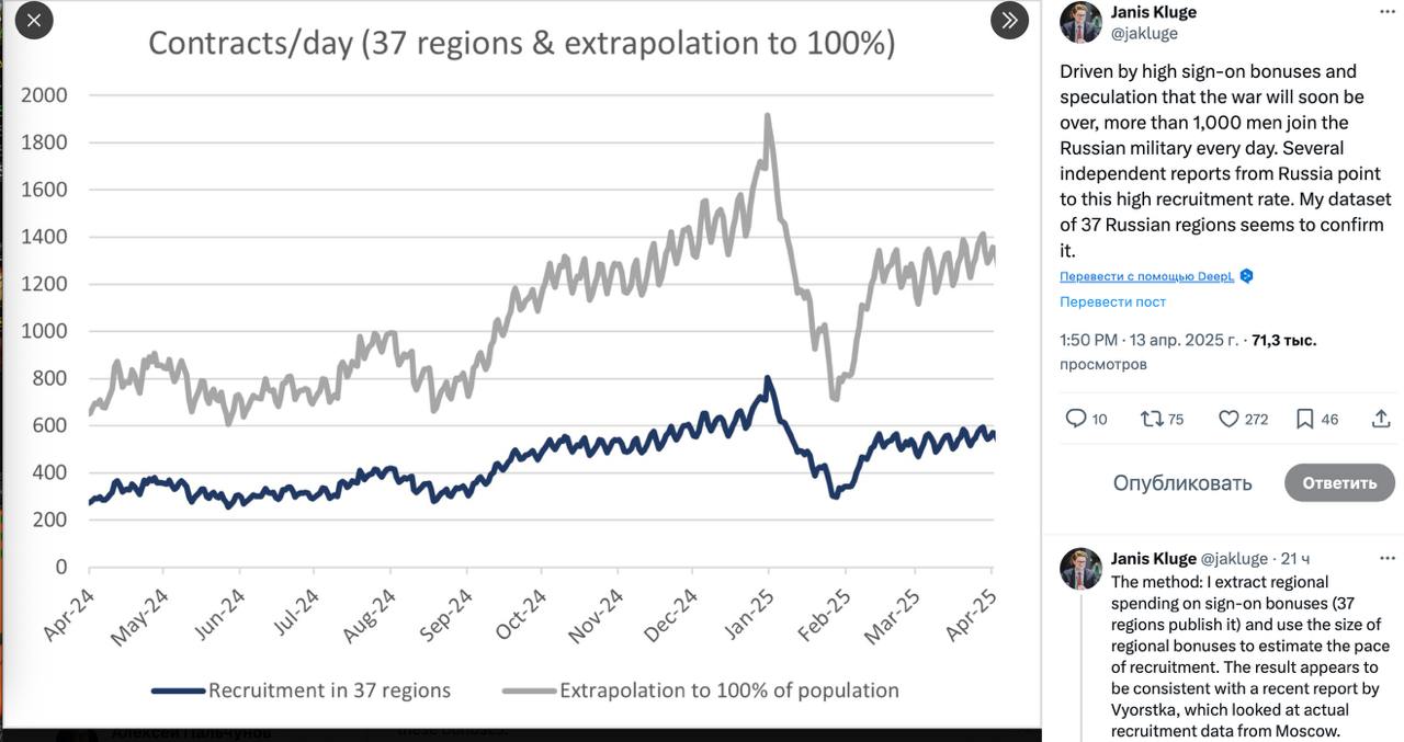 "Спонукані високими бонусами за вступ на службу та надіями на швидке завершення війни, понад тисячу чоловіків щодня поповнюють ряди російської армії. Кілька незалежних повідомлень з Росії вказують на високий рівень вербування. Моя база даних по 37 російських регіонах, здається, це підтверджує", - написав він у Х.