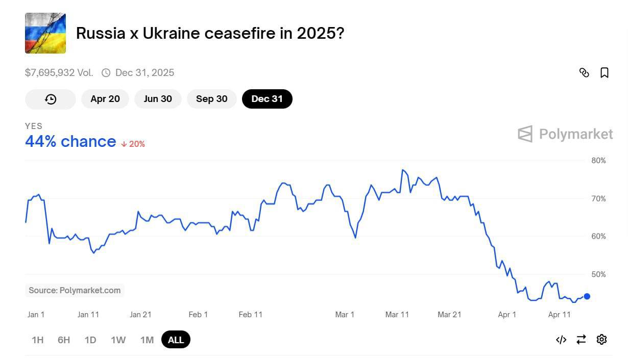 Букмекери оцінюють ймовірність припинення вогню в Україні у 2025 році у 44% проти 76% у березні.