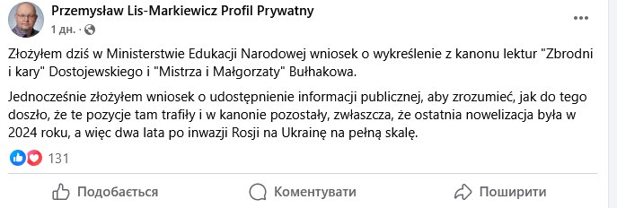 Польський правник, перекладач і письменник Пшемислав Ліс-Маркевич подав офіційну заяву до Міністерства народної освіти Польщі з пропозицією виключити з обов’язкових шкільних лектур романи Федора Достоєвського «Злочин і покарання» та Михайла Булгакова «Майстер і Маргарита».