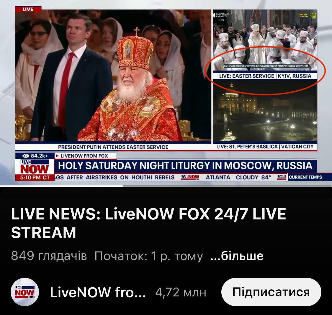 Вчора під час трансляції великодньої літургії з Києва телеканал Fox News вказав місто як «Росія».