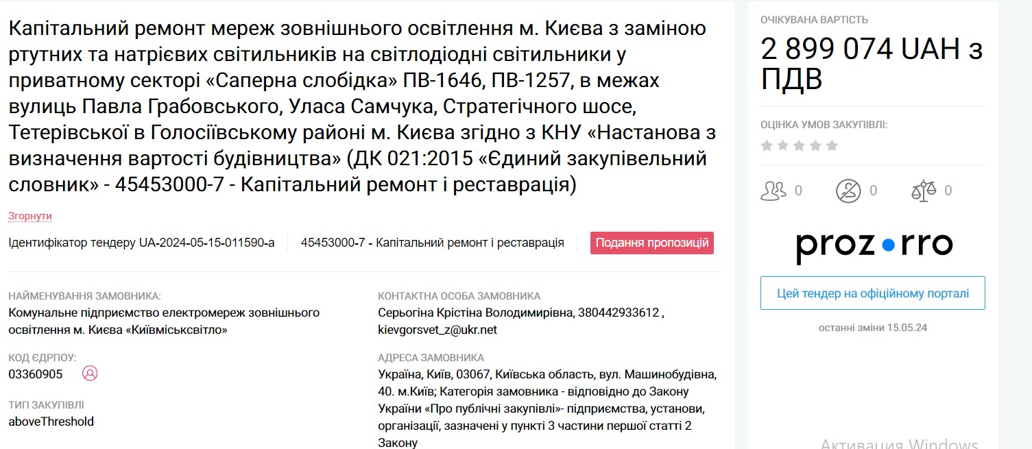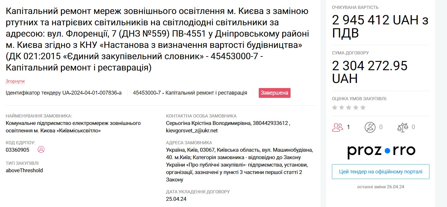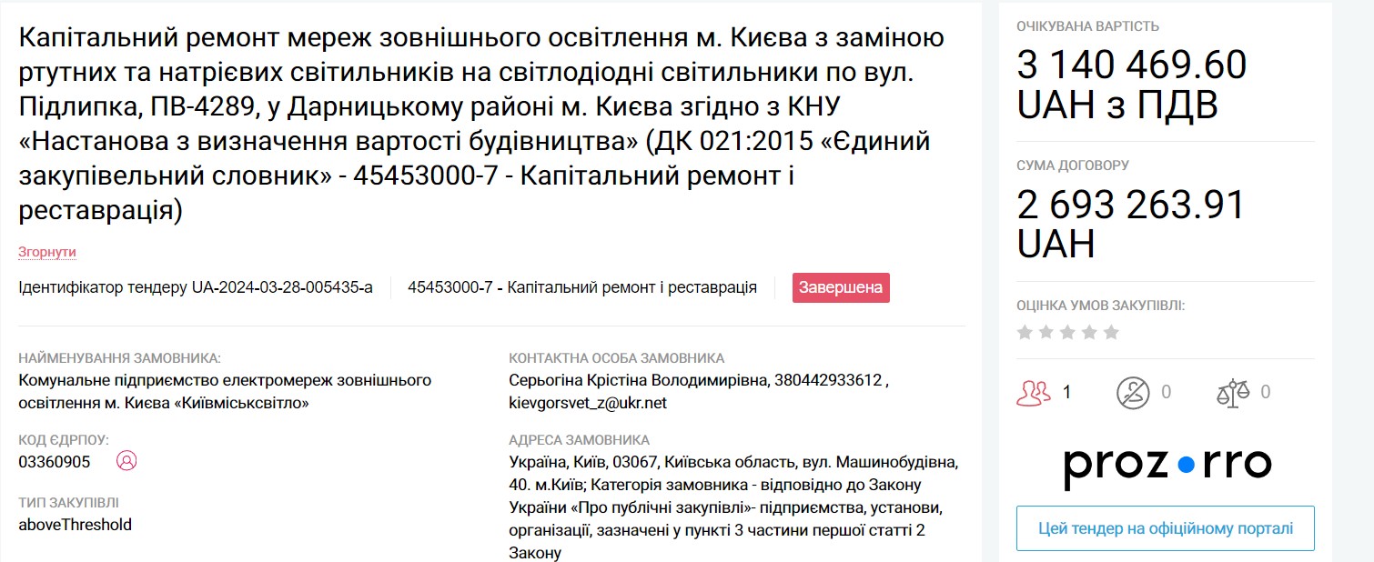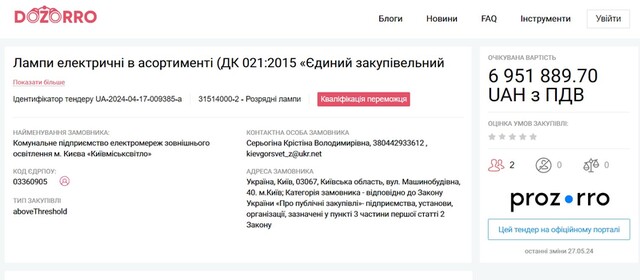 Цікаво, що часто виграє тендери від "Київміськсвітла" одна й та ж сама фірма. Про це стало відомо з тендерів, опублікованих на сайті електронної системи публічних закупівель Prozorro .