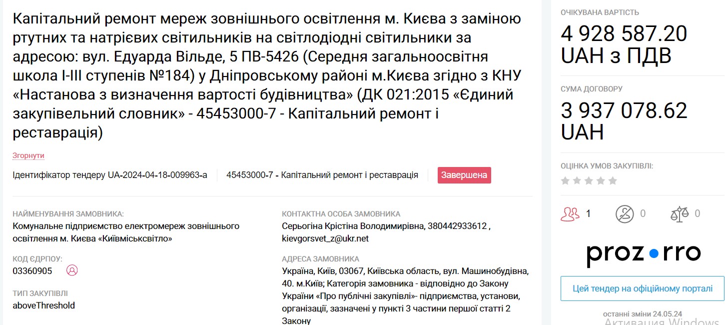 Також є тендери на заміну ламп у школі №184 на Едуарда Вільде, 5 вартістю 3 937 078 гривень та ремонт вуличного освітлення із заміною ламп на світлодіодні в ДНЗ №192 на бульв. Ярослава Гашека, 5 за 2 509 654 гривень.