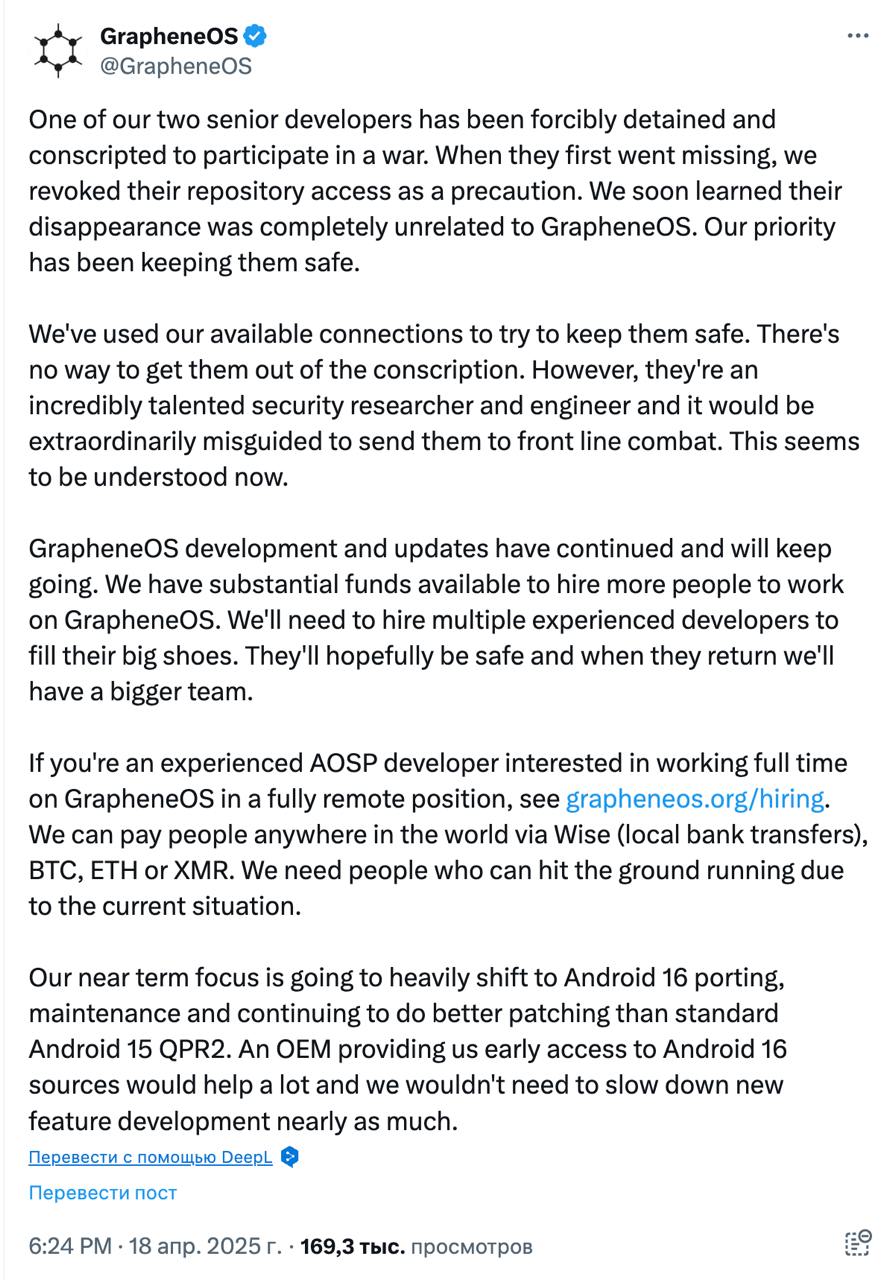 Творець мобільної операційної системи GrapheneOS повідомляє про примусову мобілізацію свого провідного розробника.