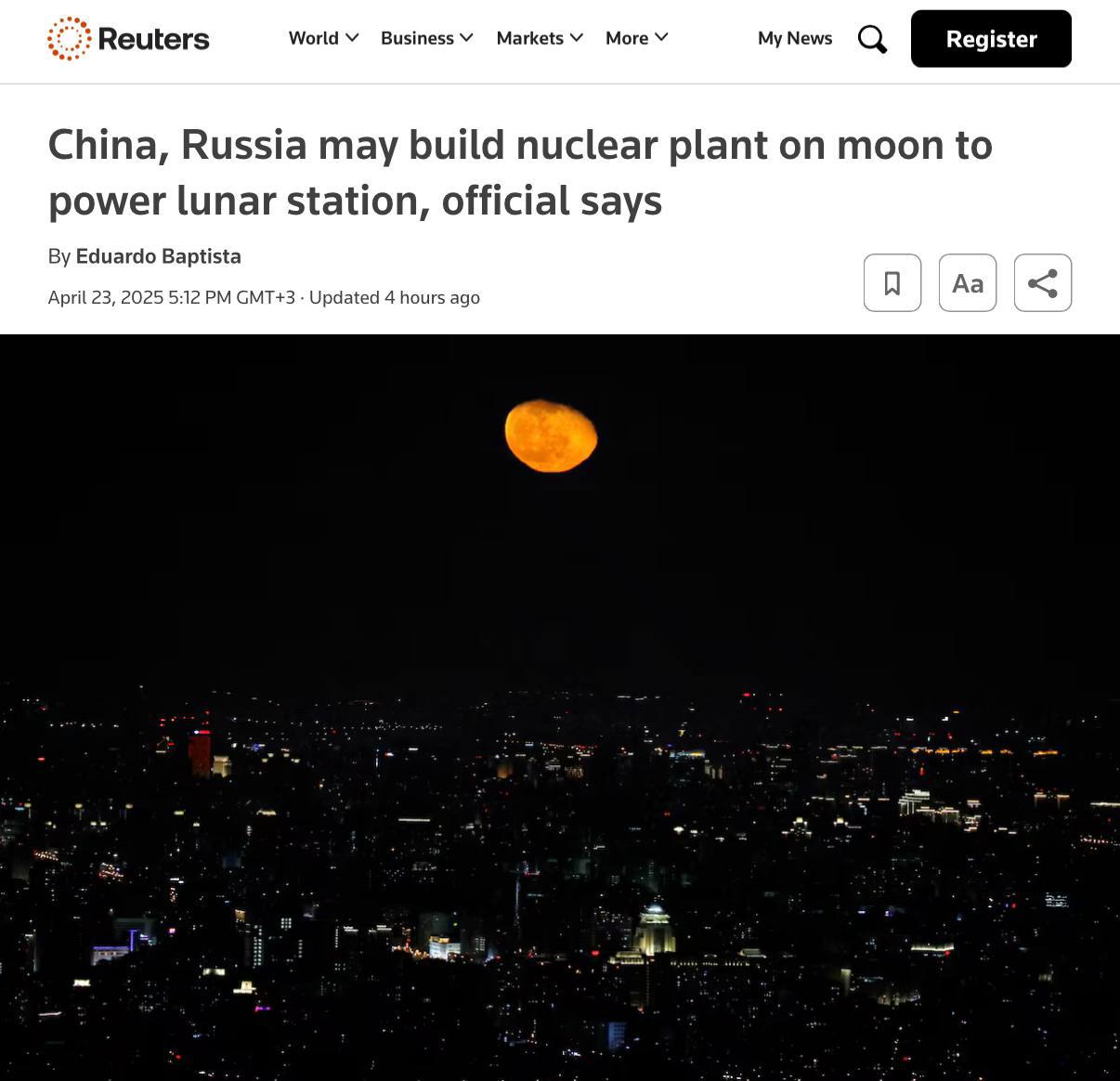 Китай прагне стати провідною космічною державою та висадити своїх астронавтів на Місяць до 2030 року. Російське космічне агентство «Роскосмос» минулого року оголосило, що збудує ядерний реактор на поверхні Місяця спільно з Китаєм до 2035 року.