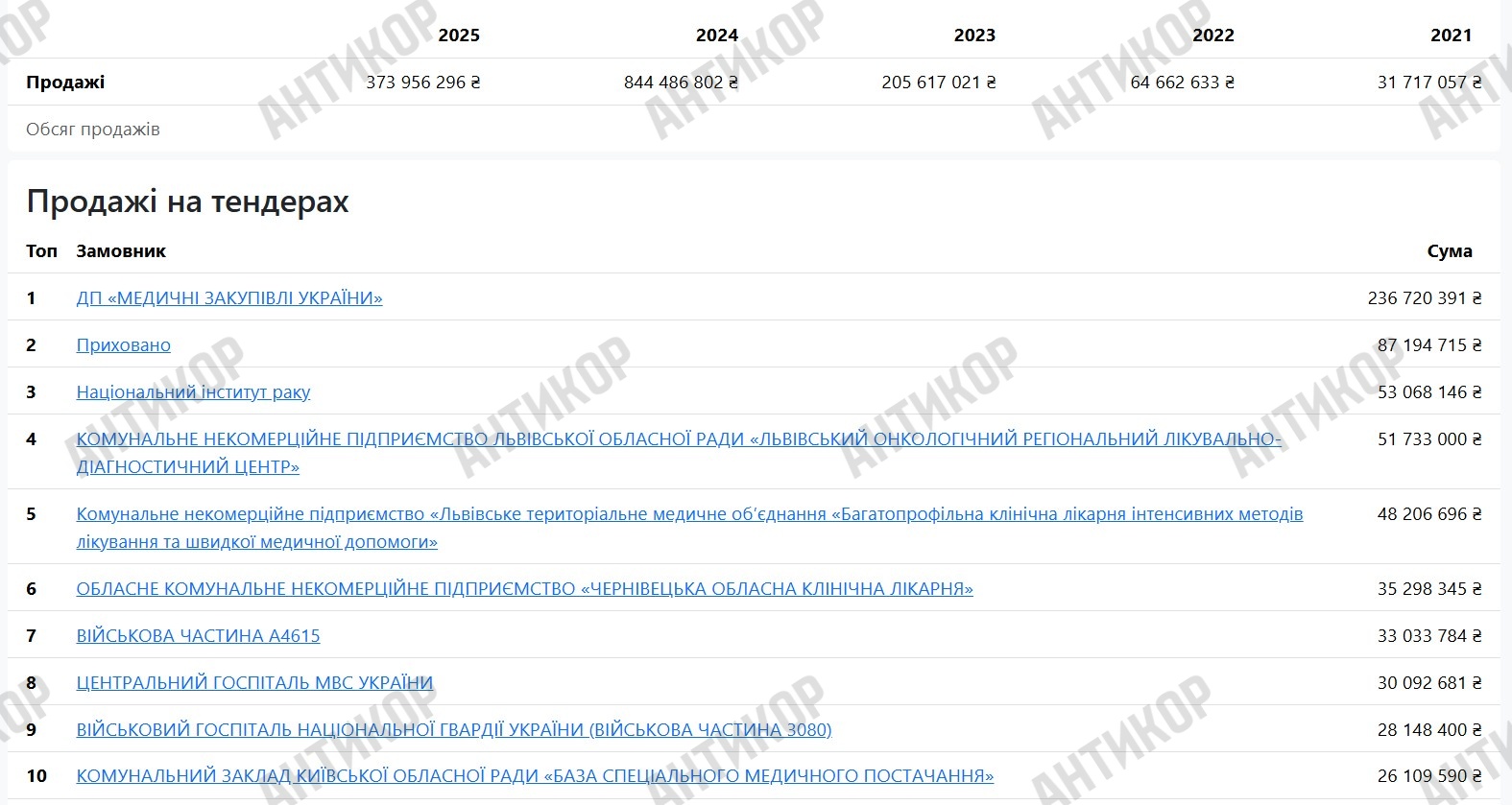 Через продаж ліків державним структурам АТ «Фармак» у 2024 році заробило 844 486 802 гривні, у 2023-му – 205 617 021 гривню, а нинішній, 2025-й, вже встиг принести компанії 373 956 296 гривень. Всього ж АТ «Фармак» є переможцем 1063 тендерів, а в першій десятці покупців – кілька військових частин.