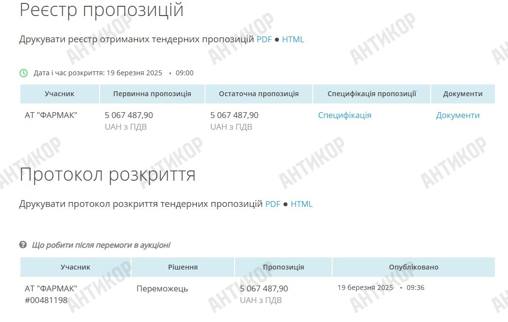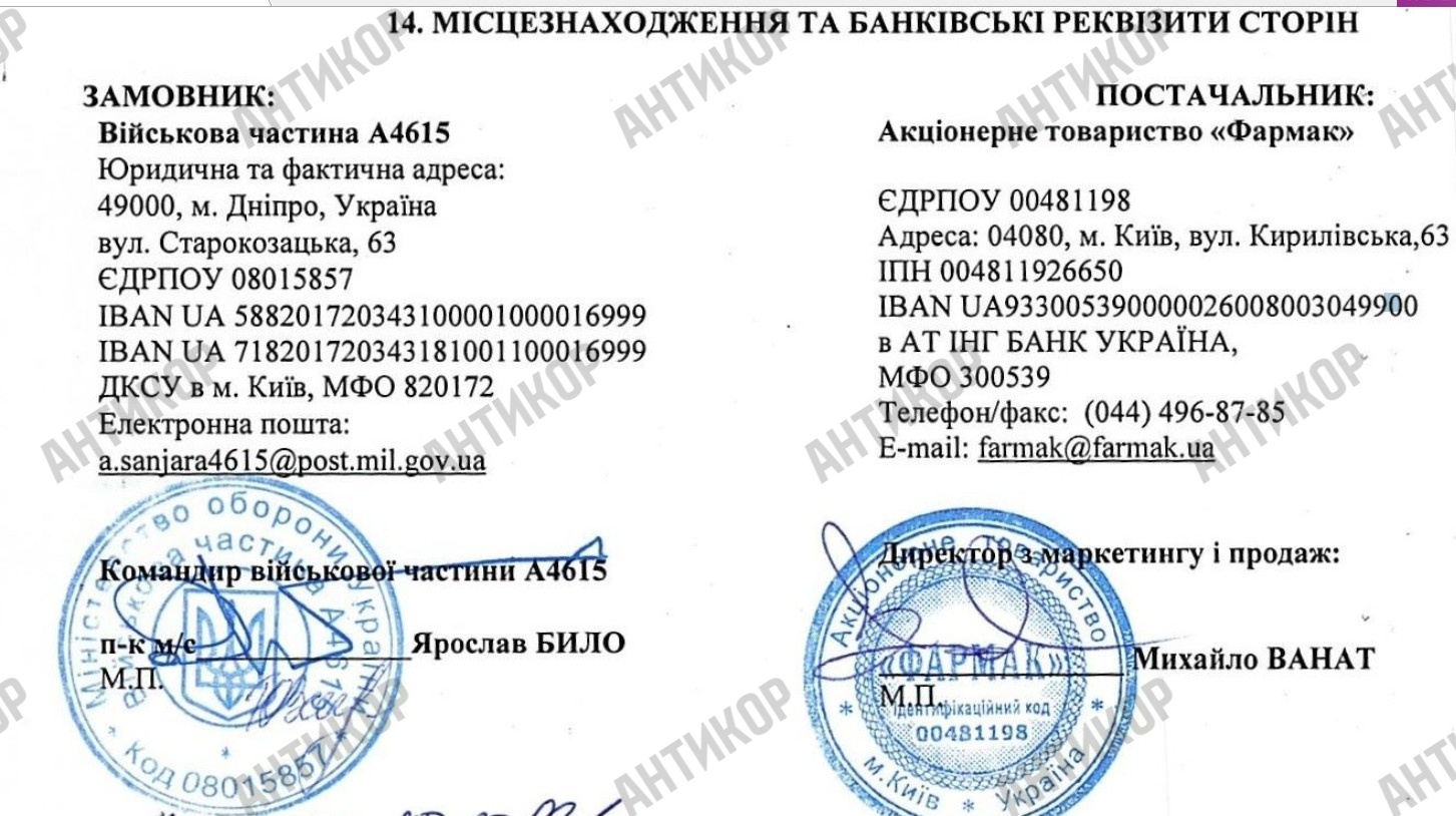 Однак вивчення контракту на постачання лікарських препаратів для в/ч А4615, яку АТ «Фармак» виграло без конкурсу 19 березня 2025 року, говорить, що завищення цін на закупівлі – звичайна практика для АТ «Фармак». Ціна закупівлі - 5 067 487,90 гривень, учасник був тільки один, він же в цьому «аукціоні» і переміг.