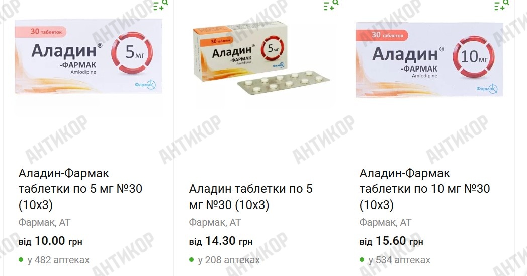 Таблетки «Аладин-Фармак» по 10 мг, які АТ «Фармак» без аукціону продає військовій частині по 0,963 гривні, в аптеках продаються по 10 грн за упаковку. В упаковці – три блістери по 10 таблеток, тобто одна таблетка коштує 0,33 гривні.