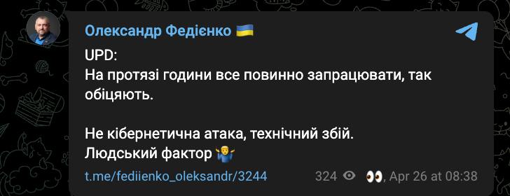 Втім, пізніше народний депутат Олександр Федієнко спростував цю інформацію. За його словами, масовий збій у роботі платіжних систем та застосунку "Дія" стався через "людський фактор", а не через кібератаку. Він також запевнив, що роботу сервісів мають відновити протягом години.