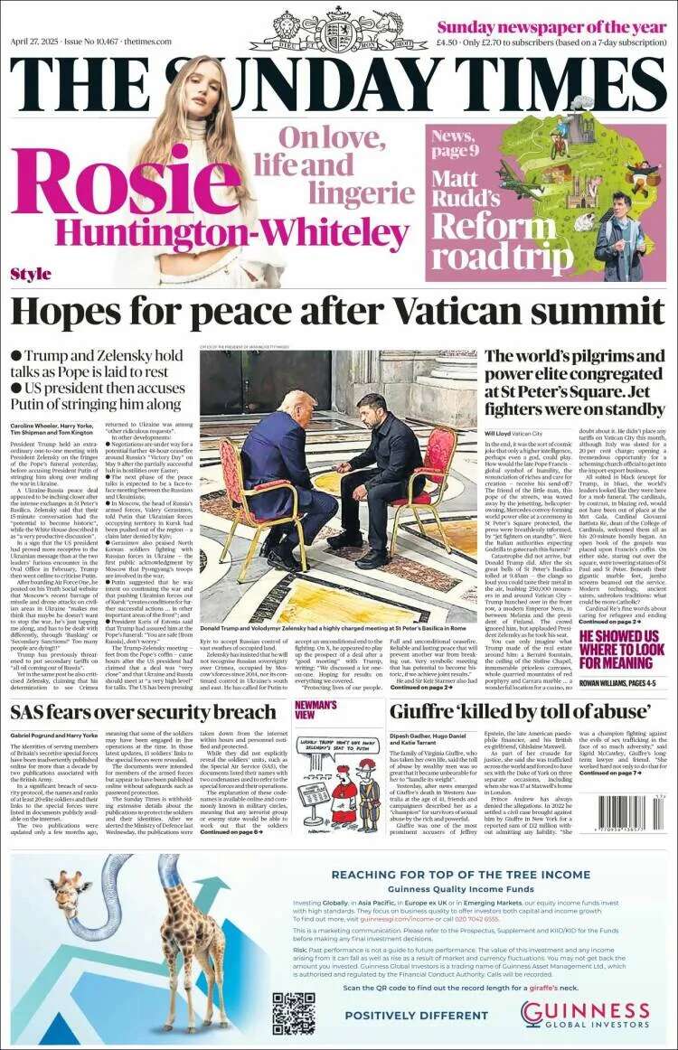 The Sunday Times виділяє можливу результативність цієї зустрічі для мирного врегулювання війни в Україні, називаючи її "Надії на мир після Ватиканського саміту".