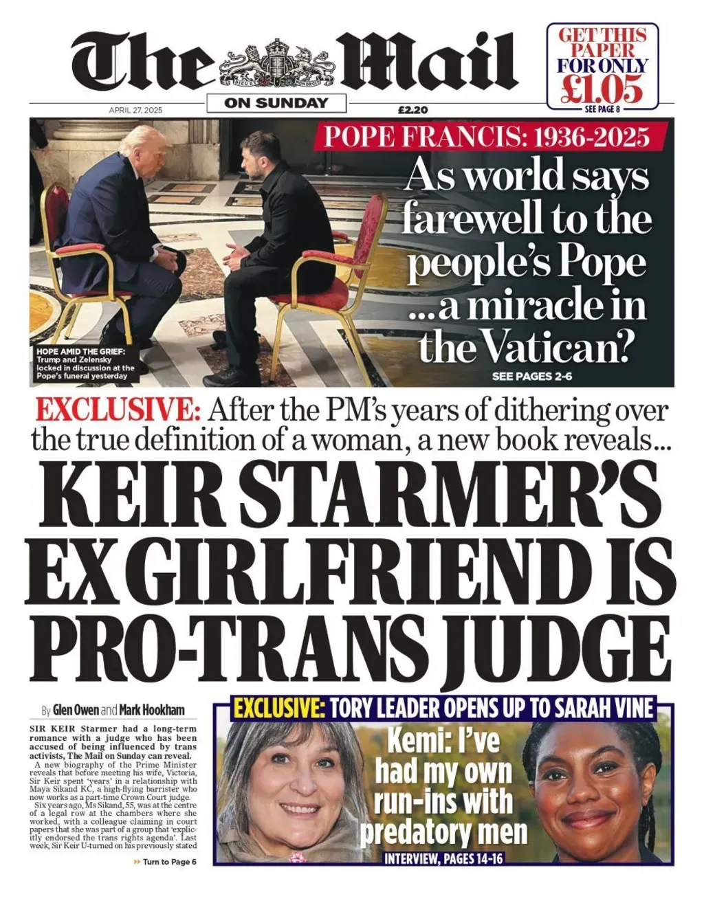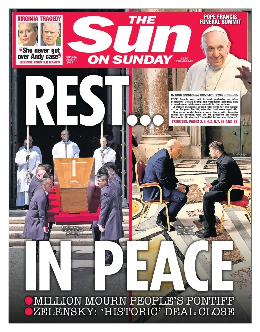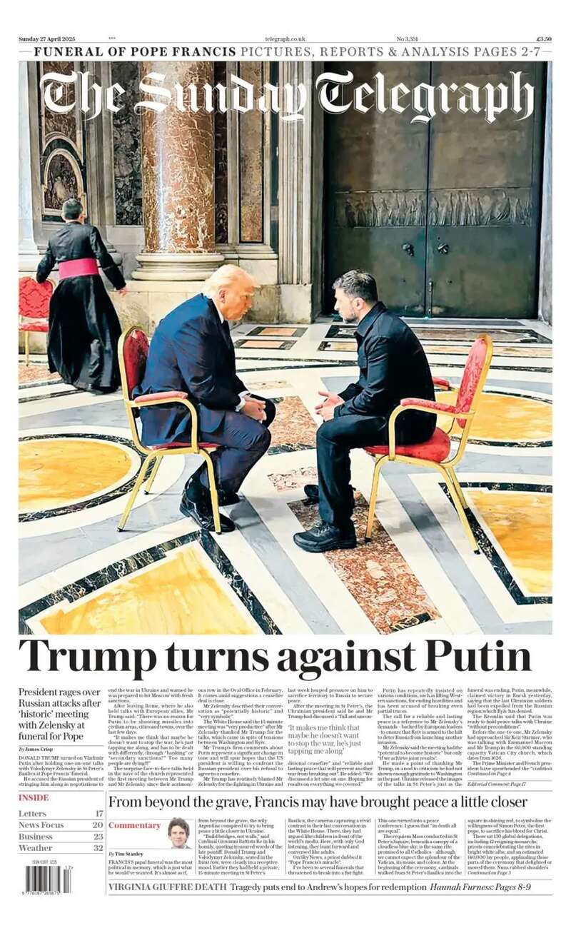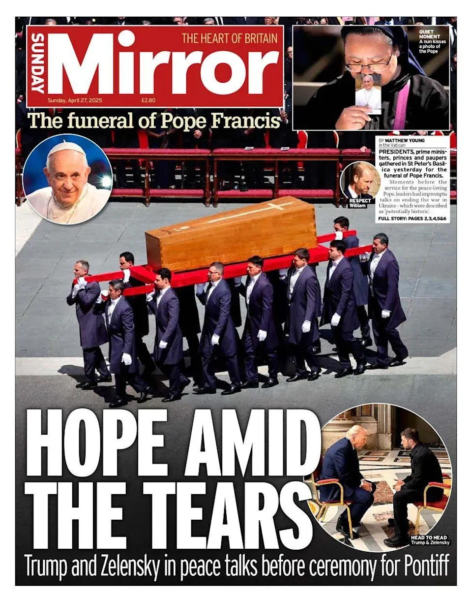 The Mail on Sunday звертає увагу на зв’язок зустрічі з похороном Папи Франциска, натякаючи на можливий позитивний результат переговорів, з підписом: "Коли світ прощається з народним Папою… диво у Ватикані?"