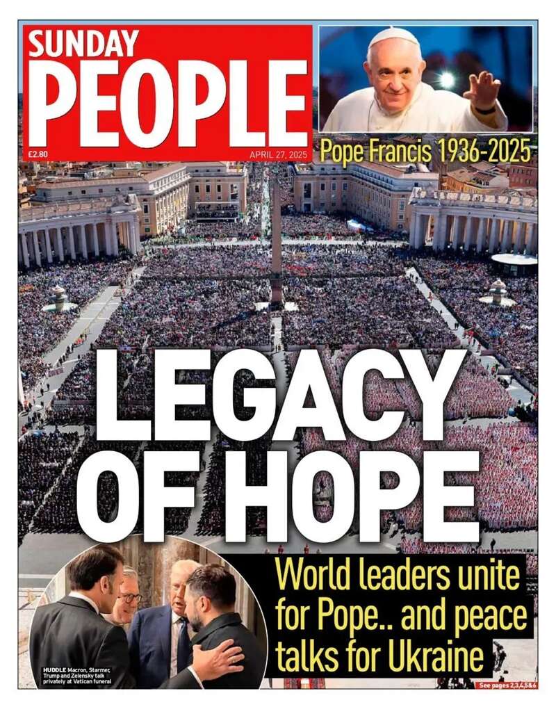 Sunday People зобразила президентів США та України разом із лідерами Великої Британії та Франції, підписавши фото: "Лідери об’єдналися заради Папи та мирних переговорів для України".