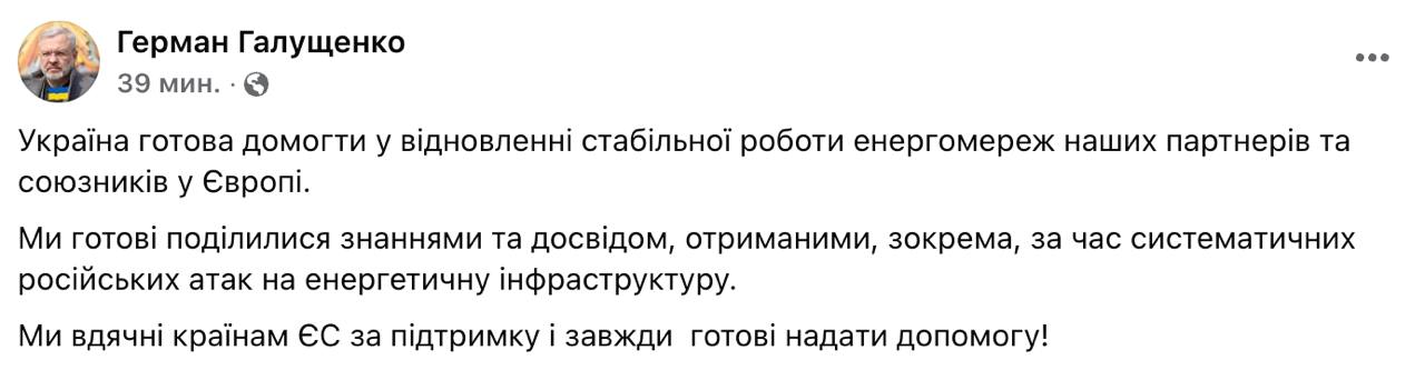За словами міністра енергетики Галущенка, Україна пропонує надати підтримку європейським країнам, які постраждали через значне відключення електроенергії на Піренейському півострові.