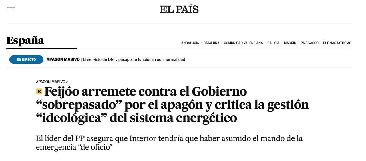 Після вимкнення електроенергії в Іспанії голова опозиційної Народної партії Альберто Нуньєс Фейхоо звинуватив уряд Педро Санчеса в надмірному захопленні «зеленою» енергетикою та недостатній концентрації на роботі атомних електростанцій, повідомляє El Pais.