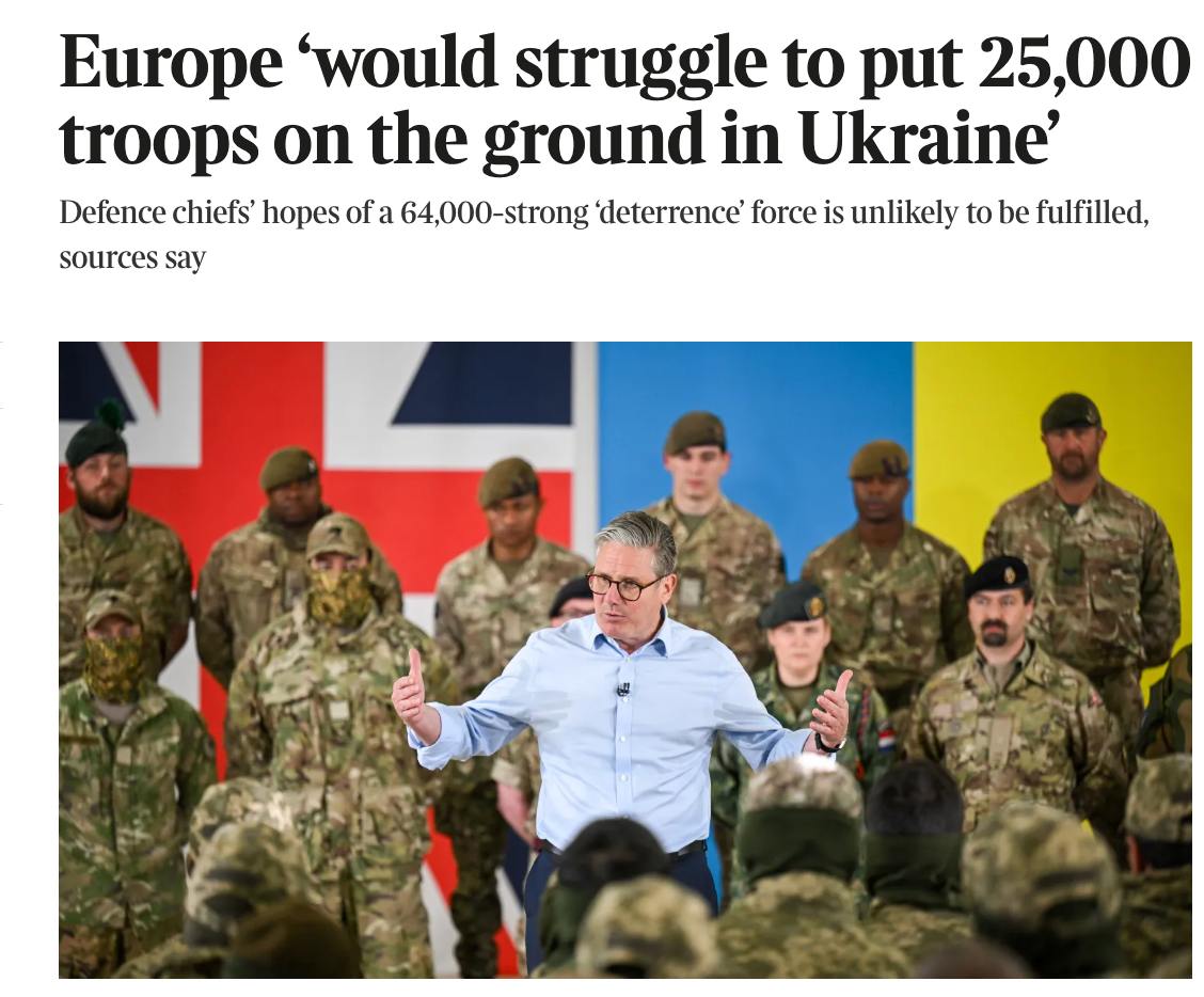 Європа точно не зможе розмістити в Україні контингент із 64 тисяч військових, як передбачалося раніше. Крім того, їй «буде важко розмістити 25 000 військовослужбовців в Україні», хоча ця цифра може обговорюватися, повідомляє газета Times.