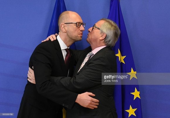 Украинцы бурно отреагировали на приветственный поцелуй премьера Арсения Яценюка с председателем Еврокомиссии Жан-Клодом Юнкером. Снимок сделан перед началом встречи, на которой обсуждались отношения Украины с ЕС в Брюсселе 7 декабря.