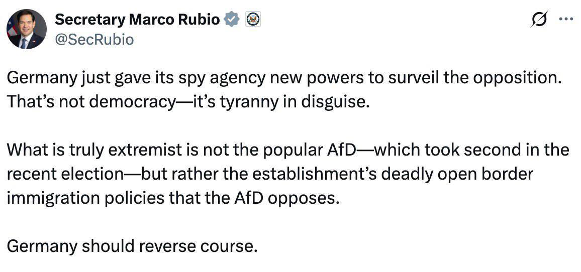 «Німеччина щойно надала своєму розвідувальному агентству нові повноваження для стеження за опозицією. Це не демократія - це прихована тиранія», - написав Рубіо.