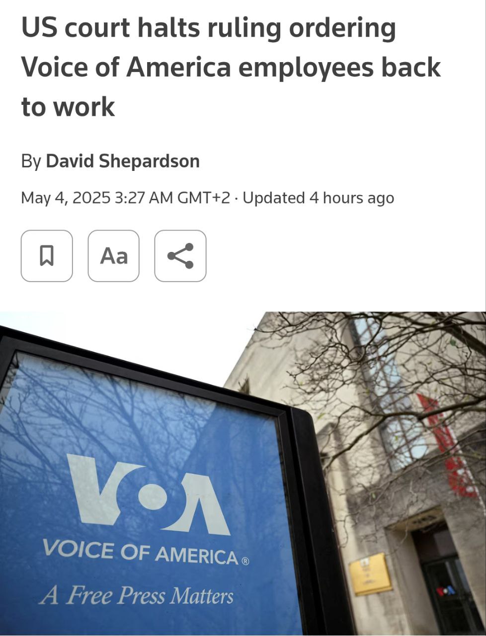 У суботу федеральний апеляційний суд США скасував рішення окружного суду, яке було ухвалене 22 квітня і вимагало повернути співробітників Голосу Америки на роботу, відновити трансляцію і видачу грантів цьому ЗМІ.