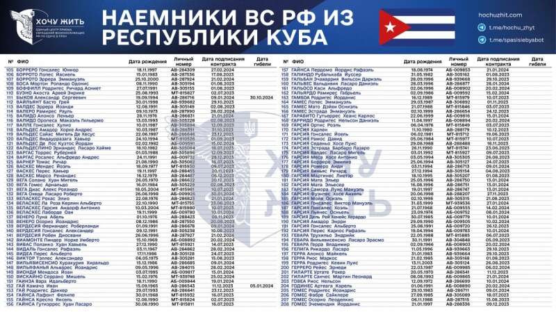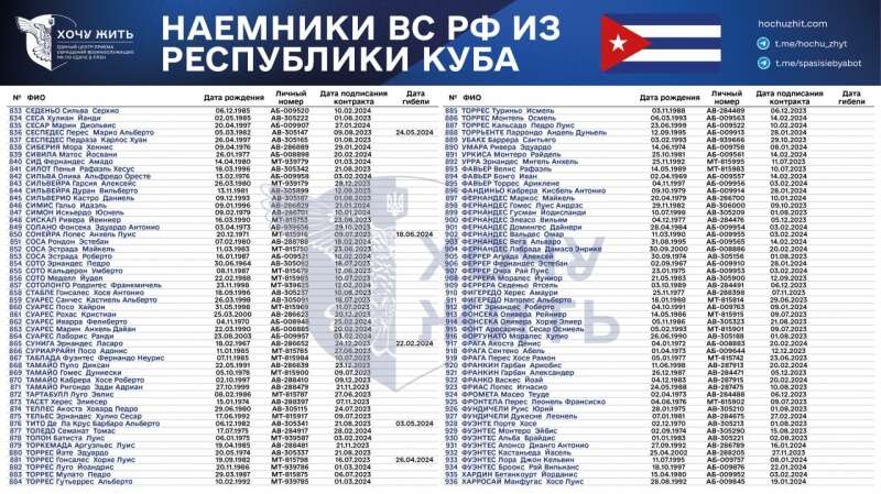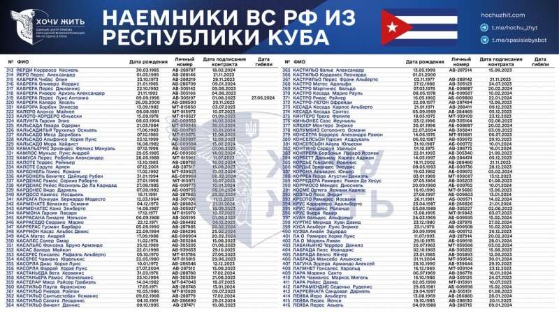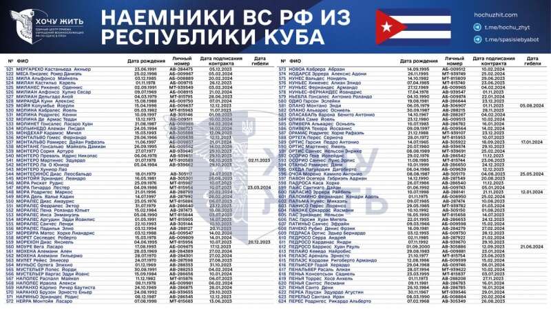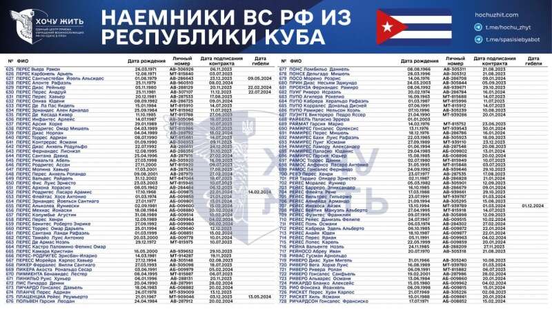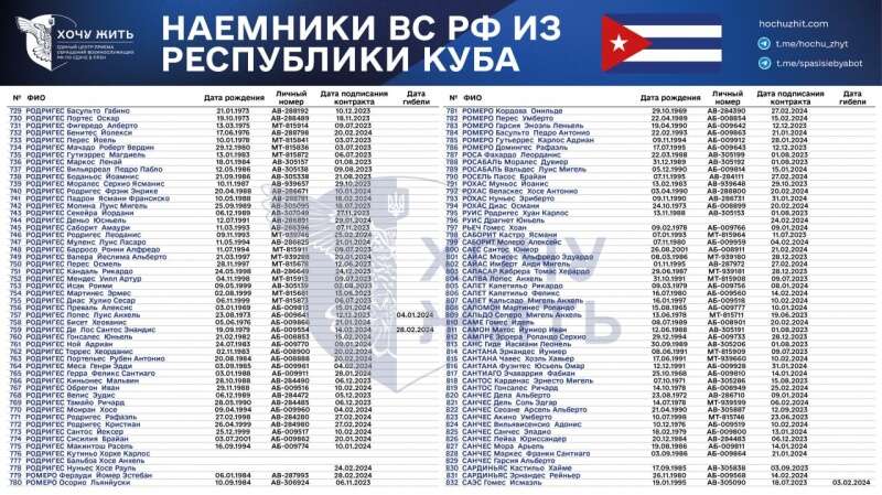 "Нам достеменно відомі імена та особисті дані 1028 кубинців, які підписали контракт із Збройними силами РФ у 2023-2024 роках", - зазначається у повідомленні.