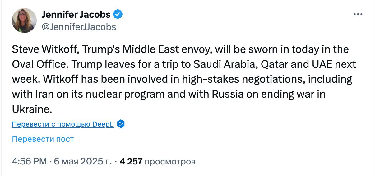 Спецпредставник Трампа Віткофф сьогодні буде приведений до присяги в Овальному кабінеті, повідомляє журналістка СBS News Дженніфер Джейкобс.