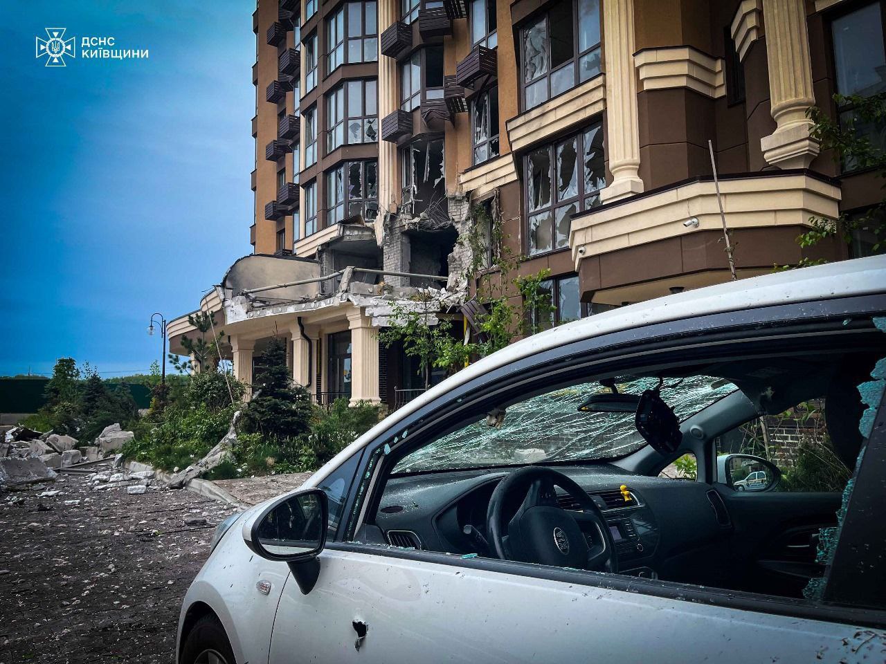 "Сьогодні о 04:36 до оперативно-диспетчерської служби Бучанського району надійшло повідомлення, що в с. Софіївська Борщагівка внаслідок ворожої атаки БпЛА виникла пожежа та руйнація конструкцій на 2-му поверсі 10-ти поверхового житлового будинку в одному з житлових комплексів. Жертв та потерпілих на місці не виявлено. Від ДСНС до ліквідації наслідків залучались 10 рятувальників та 3 одиниці техніки", – повідомили рятувальники.