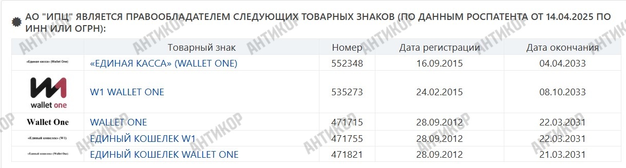Перевірка в російських реєстрах підтверджує цю інформацію. Власниками ТОВ «Інформаційно-процесинговий центр» є громадяни РФ Гірін Андрій Володимирович і Горячкін Андрій В’ячеславович, а саме ТОВ «Інформаційно-процесинговий центр» є власником торгових знаків, серед яких і Wallet One.