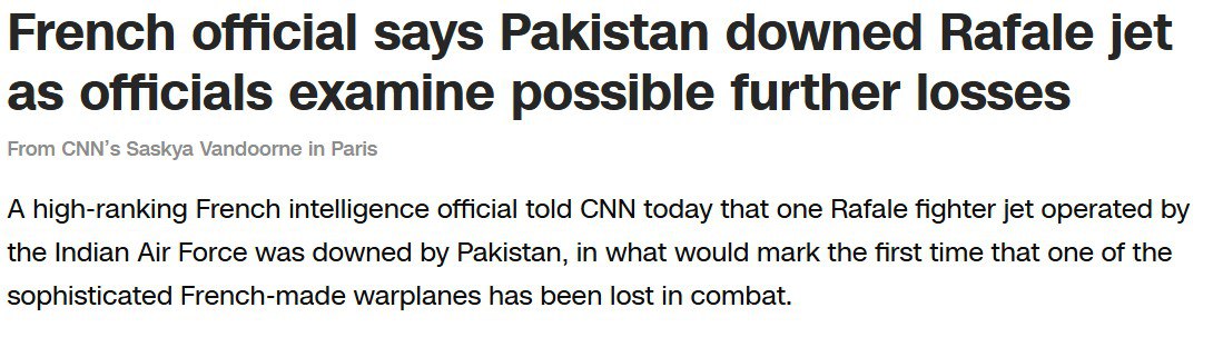 Інформацію про збитий винищувач Rafale, що належав Індії, надав у коментарі для CNN неназваний високопоставлений співробітник французької розвідки.