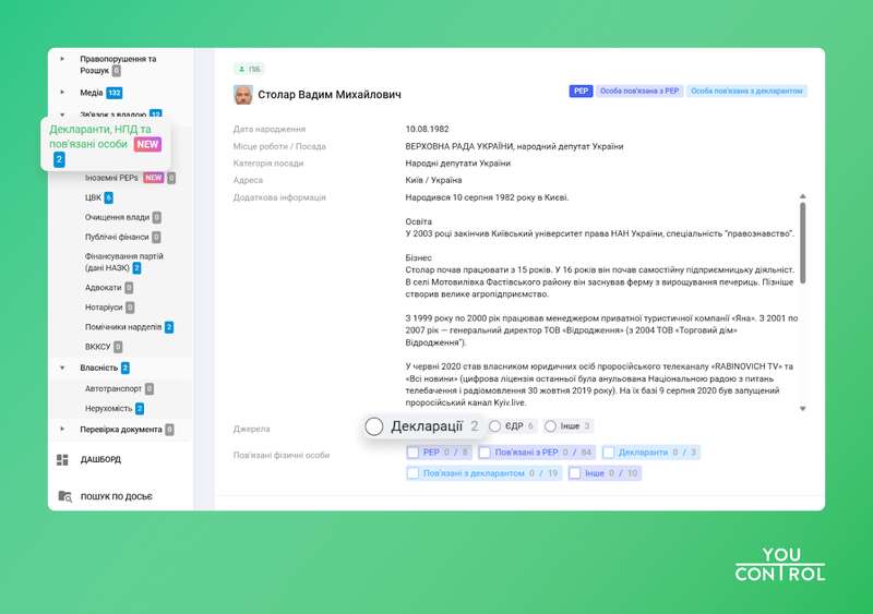 Побачити всі відкриті дані про матеріальний стан чиновників і депутатів України, а також всіх, хто за законом повинен подавати податкову декларацію, можна в Каталозі електронних декларацій в YouControl.