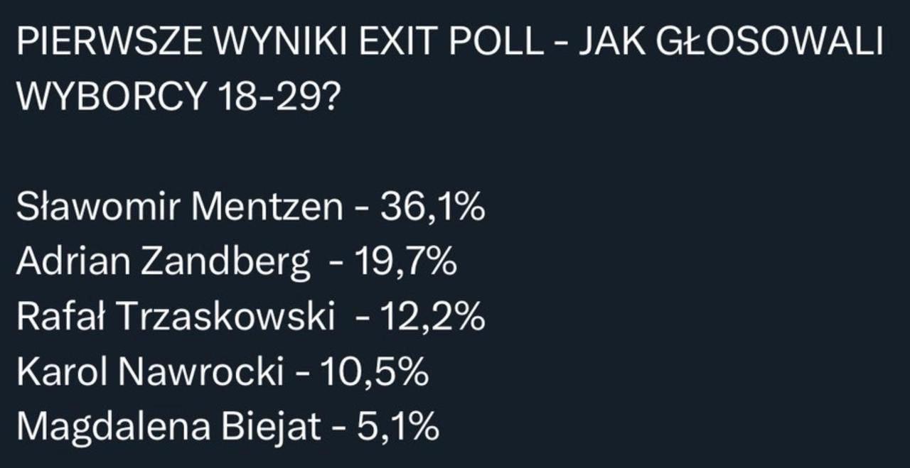 Учора на виборах серед молоді Польщі у віці 18-29 років велику підтримку отримав кандидат Славомир Менцен, набравши у цій віковій групі 36,1% голосів.