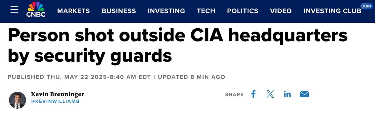 Біля входу до штаб-квартири Центрального розвідувального управління США сталася стрілянина, повідомляє CNBC.