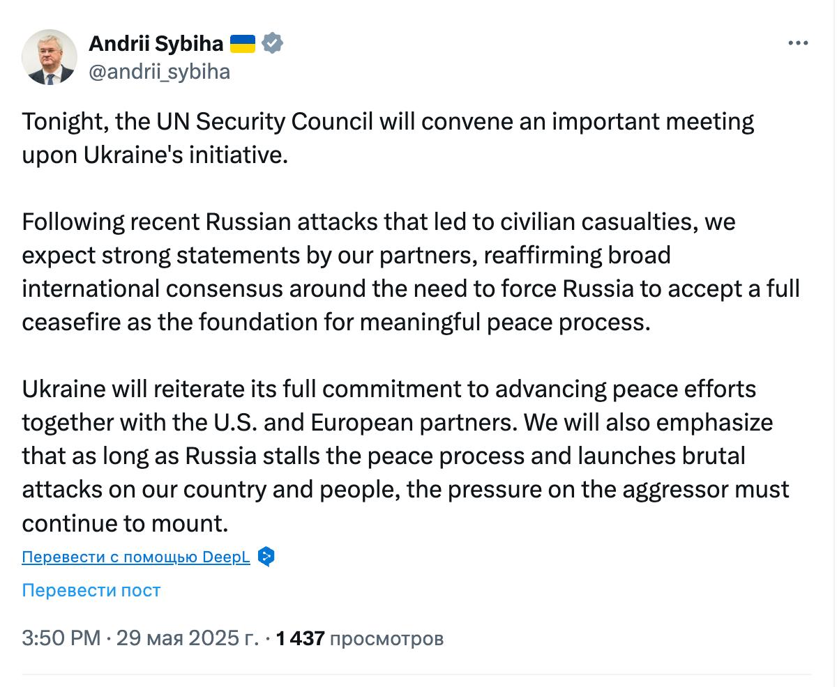 Україна ініціювала засідання Радбезу ООН після нових атак РФ, - Сибіга
