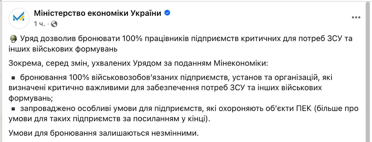 Як уточнює Мінекономіки рішення Кабміну, підприємства, важливі для функціонування ЗСУ, тепер зможуть резервувати до 100% співробітників.
